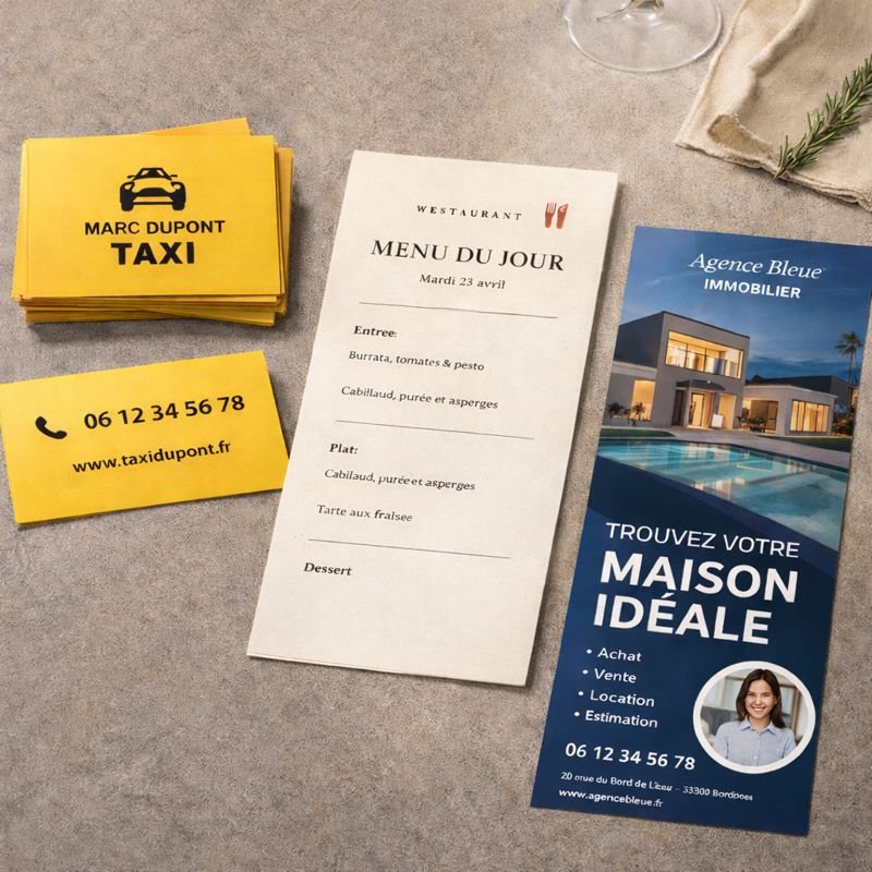 Des supports imprimés professionnels, clairs et bien structurés, conçus pour représenter votre activité avec sérieux et cohérence.